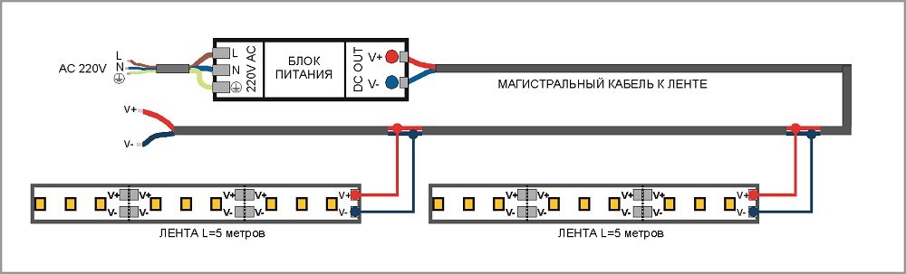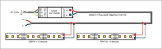 Une autre caractéristique de la procédure est la façon dont les charges sont connectées (rubans séparés). La connexion parallèle au bloc de sortie UPS au moyen d'un adaptateur spécial est typique pour eux - ses extrémités sont soudées aux points de contact de la bande. Cependant, si la longueur totale d'une bande dépasse 5 mètres, il est permis d'utiliser une connexion en série. Dans tous les autres cas, une telle connexion ne peut pas être qualifiée de correcte, car elle entraînera une diminution de la luminosité de la luminescence des éléments LED impliqués.