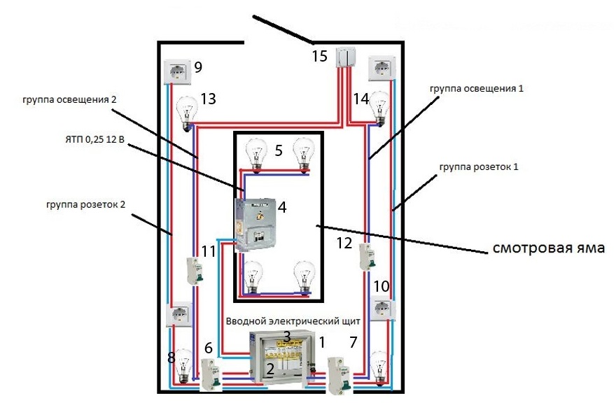 S'il y a une fosse d'inspection dans le garage, la disposition change. La fosse est considérée comme un sous-sol et des règles particulières du PUE s'y appliquent. La tension doit être réduite à 42 V. Il en résulte un transformateur abaisseur dans le circuit. Avant d'installer des luminaires et autres appareils, assurez-vous qu'ils sont adaptés à cette tension. Le circuit comprendra également des machines automatiques, un compteur, un RCD, des prises et des lampes avec interrupteurs. Un exemple de câble pour connecter des lampes est VVG 3 × 1,5, pour les prises - VVG 3 × 6.
