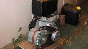 Une version plus complexe implique l'utilisation d'un ancien tracteur à conducteur marchant utilisé comme entraînement. La fonction de générateur dans ce système est assurée par un moteur asynchrone avec une vitesse de rotation allant jusqu'à 1600 tr/min et une puissance effective allant jusqu'à 15 kW. Pendant le processus d'assemblage, son mécanisme d'entraînement est relié à l'axe du tracteur à conducteur marchant au moyen de poulies et d'une courroie. Le diamètre des poulies est choisi pour que la vitesse de rotation du moteur électrique converti en générateur soit supérieure de 15 % à la valeur indiquée sur la plaque signalétique.