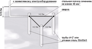 Une option populaire pour faire un circuit de protection est sous la forme d'un triangle, où les électrodes sont les sommets. Les broches sont reliées par des bandes métalliques, un élément similaire est tiré vers le tableau. En fonction de la résistance du sol, les tiges sont installées à une distance de 1,2 à 3 m.