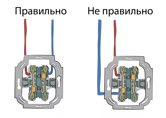 - Nous insérons les fils dans les contacts de manière à ce qu'ils dépassent de l'autre extrémité de 2-3 mm. Vous devez l'insérer sur le côté gauche du boulon afin que lorsqu'il tourne, le fil ne pousse pas hors de la douille.