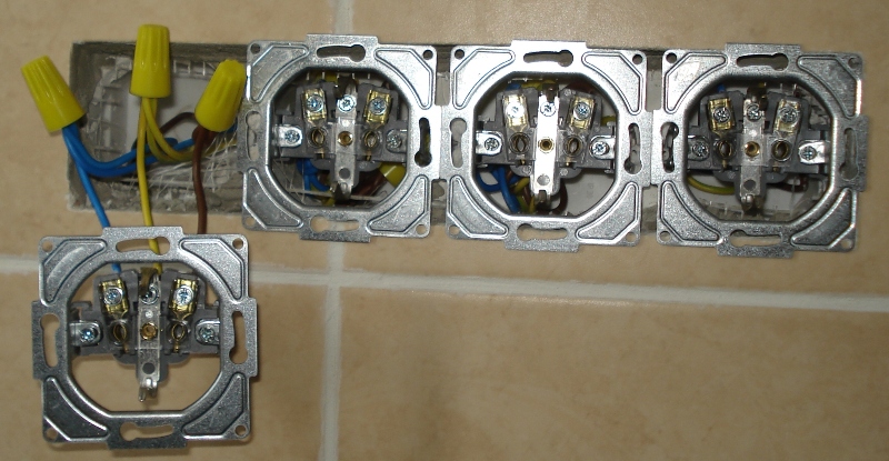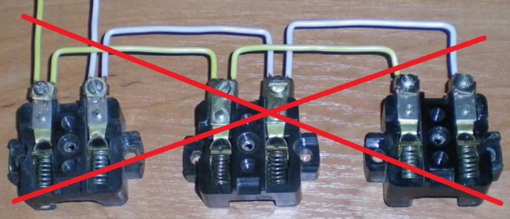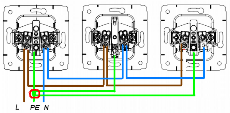 La connexion de plusieurs prises s'effectue avec un câble à trois conducteurs. Le premier est connecté au câble d'alimentation de la boîte de jonction. Ensuite, toutes les prises doivent être connectées ensemble. Dans ce cas, les trois noyaux sont connectés par une boucle - phase, zéro et terre. La connexion sur une borne du conducteur PE réduit la fiabilité et dégrade le contact. Par conséquent, les extrémités du fil de terre sont serties sur la borne de dérivation. Cet endroit est isolé avec un capuchon. Le terminal doit avoir une rondelle rectangulaire.