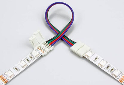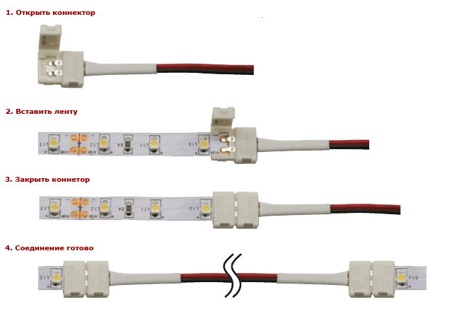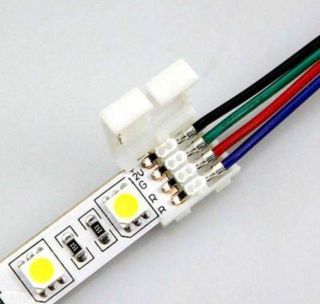 - La fixation des connecteurs s'effectue au moyen de clips en plastique. Les connecteurs sont le plus souvent utilisés lorsqu'il est nécessaire de connecter la bande LED dans des positions incommodes, mais il est impossible de souder les contacts. Cette méthode est simple et pratique, mais elle est lourde d'oxydation des contacts.