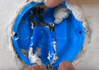 À partir de mélanges, vous pouvez utiliser du gypse et de l'albâtre. Le gypse durcit en 3 à 5 minutes, et si cela ne pose pas de problème pour le produit à installer, la solution préparée ne fonctionnera pas après ce temps. Pour augmenter le temps de durcissement de 10-15 minutes, il est recommandé d'ajouter du plâtre au mélange dans un rapport de 3: 2. Il est permis d'utiliser le mastic comme base indépendante, mais il ne maintient pas les produits installés aussi étroitement que le gypse ou ses mélanges. Avant d'enduire une niche de la composition, celle-ci est pulvérisée avec de l'eau provenant d'un flacon pulvérisateur. Au niveau de la prise, la fiche du câble est coupée, la boîte est insérée dans la niche, la position est nivelée et l'excès de solution est retiré.