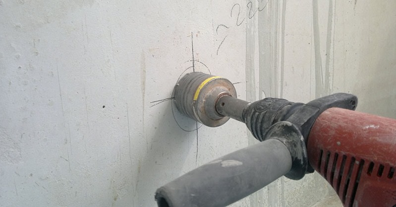 Avant de fixer la prise au mur, vous devrez percer un trou en dessous. Une perceuse électrique avec une couronne de diamant est la mieux adaptée pour cela, mais en raison du coût élevé d'un tel outil, des machines de perforation avec une buse adaptée pour fendre le béton sont plus souvent utilisées.