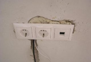La meilleure façon d'installer les prises de courant dans les évidements est d'enduire les produits d'un mélange de rotband et d'albâtre. Avant cela, vous devez nettoyer les rainures avec un aspirateur et humidifier légèrement les murs avec un chiffon humide. La solution préparée est appliquée avec une petite spatule de manière à offrir la plus grande surface de contact possible avec le produit. L'excès de composition est ensuite éliminé. Le mélange est également appliqué sur la douille elle-même, puis inséré en place.