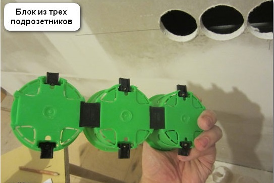 Les modèles conventionnels sont conçus pour être joints par des saillies sur la boîte. Le bloc pour plaques de plâtre est assemblé à l'aide de connecteurs spéciaux. Ils ont un diamètre standard. Dans les première et dernière cases, un bouchon latéral est retiré, dans les autres, deux. L'adaptateur est installé dans le siège et encliqueté en place. Une deuxième boîte y est attachée. Ainsi, les boîtiers de prises sont rassemblés dans une ligne commune. Dans la première boîte, une prise est retirée, un fil d'alimentation la traverse. Ensuite, vous devez installer le bloc assemblé.