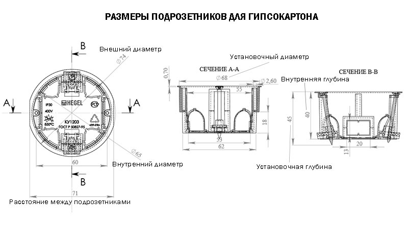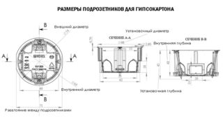 - Les dimensions de la douille sur les cloisons sèches varient - la profondeur de plantation est de 40 à 62 mm, le diamètre est de 60 à 75 mm. Lors du choix, tenez compte de l'épaisseur de la feuille et de la distance entre elle et le mur.