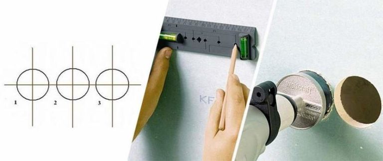 La section sélectionnée du mur est imprégnée d'un apprêt. Après séchage, appliquez une fine couche de mastic. Cela rendra la plaque de plâtre plus solide, elle ne s'effritera pas pendant le fonctionnement. Ensuite, le balisage est effectué. Un trou est percé dans la zone marquée avec une couronne. Il s'agit d'un foret spécial avec des dents pointues le long du bord. Vous pouvez utiliser une perceuse ordinaire, puis découper le trou avec un couteau de construction.