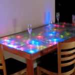 Pour décorer la salle à manger, il est préférable d'utiliser des produits colorés de faible puissance. Vous pouvez fixer la bande au bout d'une table en bois ou sur le fond le long du périmètre sur le verre. Faites passer le câble le long du pied et connectez-le à la prise la plus proche.