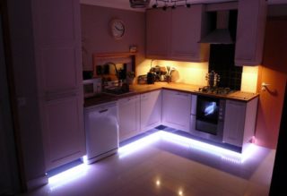 Vous pouvez les connecter de manière ouverte et semi-fermée. Dans le premier cas, des bandes colorées sont collées au bas des étagères en une ou plusieurs lignes, créant un éclairage doux et diffus. La version fermée permet de résoudre deux problèmes : l'éclairage de la zone de travail et la décoration. Le ruban est fixé dans la boîte à l'écart du tablier.