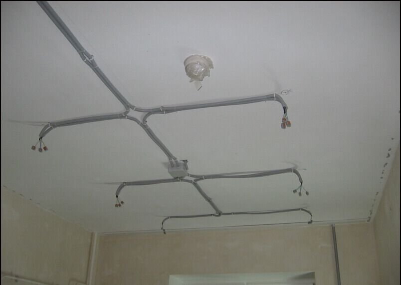 Le câble d'alimentation du marquage VVGng est posé avant de tendre la toile selon le tracé de pose des points lumineux. La section minimale du câble est de 1,5 mm2. Moins ne peut pas être utilisé même avec des charges légères.