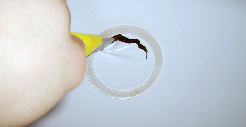 La colle est appliquée uniformément sur tout le périmètre de l'anneau. Il ne doit pas y avoir de zones non collées. Vous n'avez pas besoin de passer votre doigt le long de l'anneau lorsqu'il est pressé contre le plafond, à cause de la colle, il peut glisser sur le côté. Une simple pression suffit.