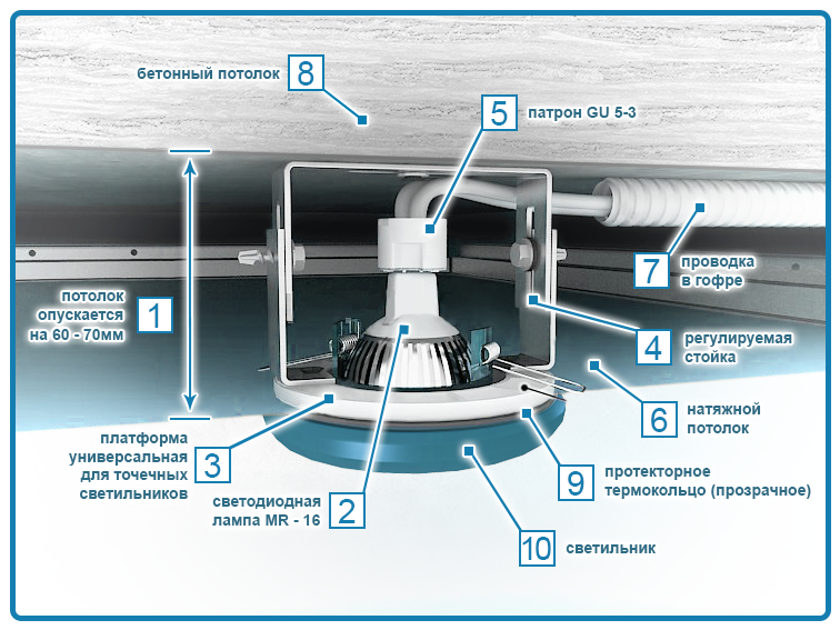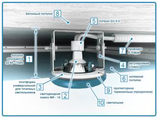 Avec une base plane, les plafonds tendus dans lesquels les lampes sont installées donnent toujours un affaissement de 3-3,5 cm.Il s'avère que si les plates-formes encastrées sont placées légèrement au-dessus des profils de plafond, le dispositif d'éclairage sera enfoncé dans la toile . Par conséquent, ils doivent être abaissés près du plafond, mais seulement après l'avoir étiré. Les encastrements ne doivent pas toucher la toile, vous devez vous en éloigner de 1 à 2 mm.