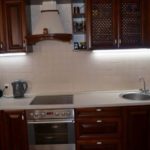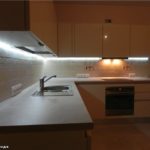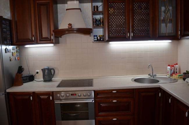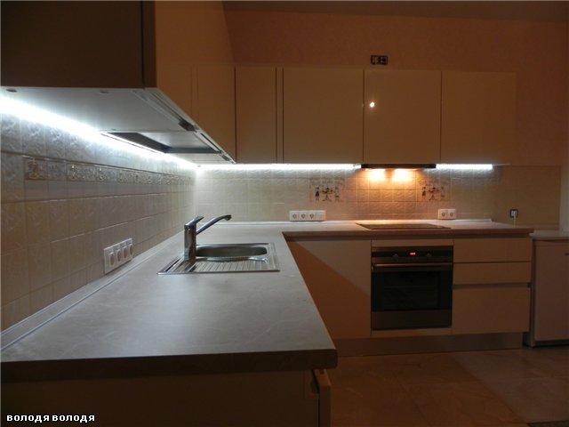 - Le rétroéclairage avec des bandes LED est l'un des plus courants. Cela est dû à un grand nombre d'avantages, à savoir une consommation d'énergie économique, une lumière douce et chaude, utilisée pour la décoration, car elle a des couleurs différentes. Il n'y a aucune difficulté d'installation - il est collé sur n'importe quelle surface à l'aide d'une base collante. Ce type d'éclairage est considéré comme le plus approprié pour la cuisine, car il ne craint pas la saleté et l'humidité. Les rubans sont faciles à nettoyer, ils tolèrent bien les surtensions et les changements de température.