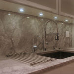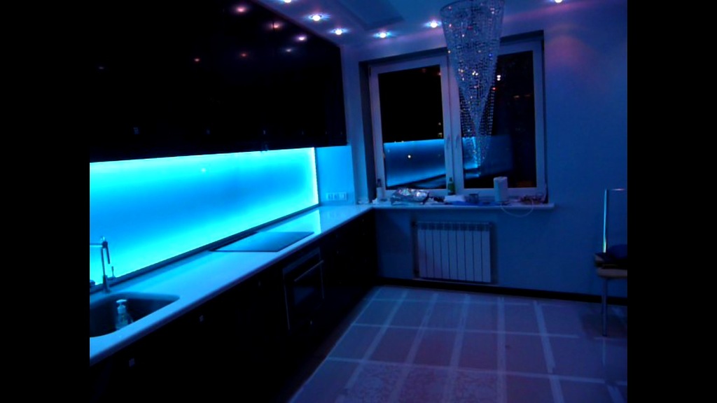 Le rétroéclairage est installé non seulement sur les armoires murales et les murs, mais également sur la surface de travail. Dans de tels cas, des panneaux LED sont utilisés. Leur avantage est qu'ils illuminent l'espace et ont un aspect attrayant - deux verres avec des images représentées dessus. Le verre a un degré élevé de trempe, il ne peut donc pas être brisé. Les seuls inconvénients des panneaux LED sont le prix élevé. Ils doivent être installés par un maître doté de compétences et d'outils spéciaux.