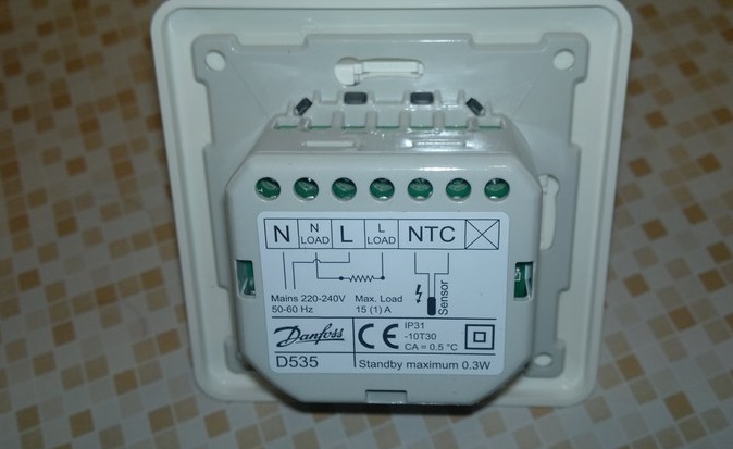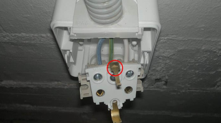 La prise est connectée avec la bonne polarité. Le zéro de travail sera à gauche, la phase à droite. La masse est située au milieu de l'appareil et est fixée avec une borne.