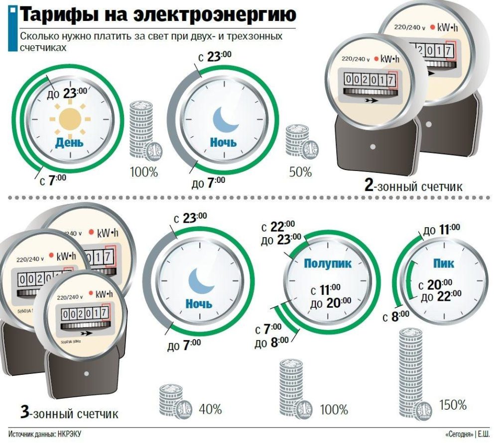 Les compteurs multitarifs prennent en compte la consommation d'électricité en fonction de la congestion des réseaux et de l'heure de la journée. Celui à deux taux diffère par les indicateurs de jour et de nuit. Dans un compteur à trois tarifs, le prix est inférieur à la norme en période de faible encombrement du réseau, le minimum la nuit. En période de pointe de consommation, le tarif augmente.