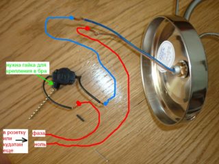 - Raccordement direct au réseau électrique de la maison. C'est ainsi qu'ils montent des interrupteurs pour appliques avec une chaîne ou une corde.Dans ce cas, le mécanisme de fermeture et d'ouverture lui-même est situé dans le luminaire. De tels dispositifs sont disposés en fixant une plaque spéciale au mur, dans laquelle les fils de câble sont conduits. Torsadez les conducteurs ensemble selon les couleurs ou les marquages - L pour phase, N - pour zéro, PE - mise à la terre.