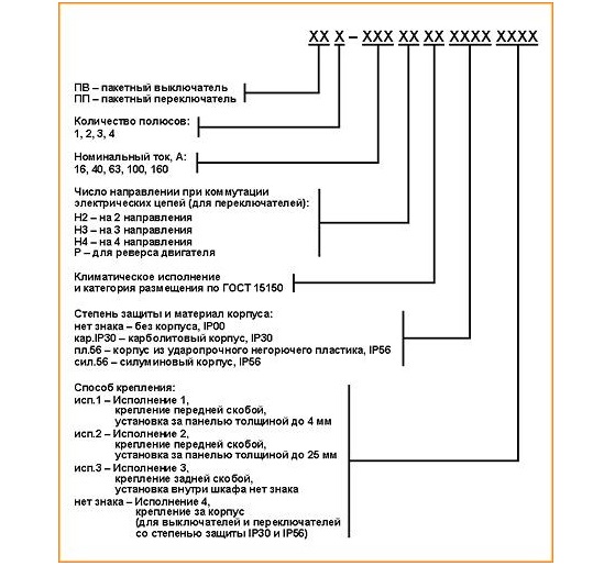 La désignation de l'appareil doit indiquer le degré de protection, ainsi que le type, les caractéristiques d'installation et le courant nominal. Sur certains modèles, des badges sont appliqués, indiquant le matériau du boîtier du produit : plastique résistant à la chaleur ou silumin.