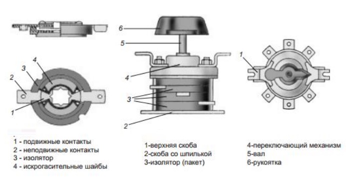 Lors de l'examen des détails du commutateur, il convient de prendre en compte sa conception, selon laquelle il peut s'agir d'une came ou d'un disque. Les unités de travail de la première de ces modifications ont des contacts fixes fixés sur un substrat carré isolé du corps. L'unité mobile du groupe de contact est réalisée sous la forme de couteaux, coulissant vers l'intérieur et l'extérieur pendant la commutation au moyen d'une poignée manuelle.