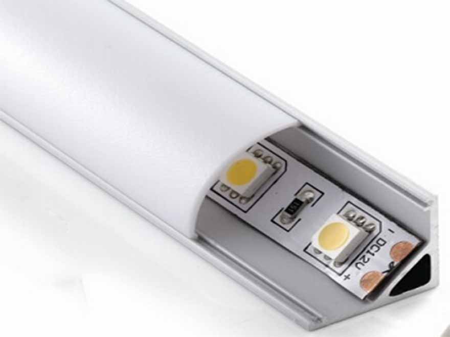 - Angulaire. Il est généralement utilisé pour éclairer les espaces intérieurs où la lumière doit tomber à un angle de 45 degrés (armoires, armoires, mezzanines). Le profilé est constitué de deux parois reliées entre elles à angle droit et d'une face avant avec un écran en verre.