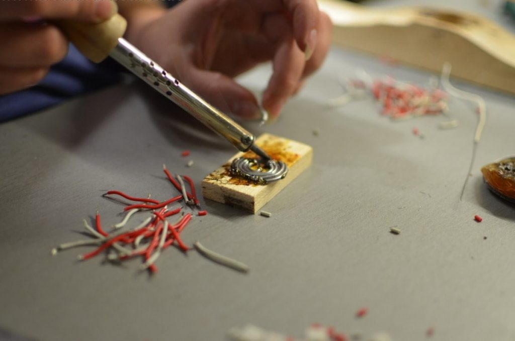 Il existe plusieurs façons d'étamer. Certains artisans préfèrent la méthode, dont l'essence est de presser les fils avec un fer à souder sur une surface plane en bois.