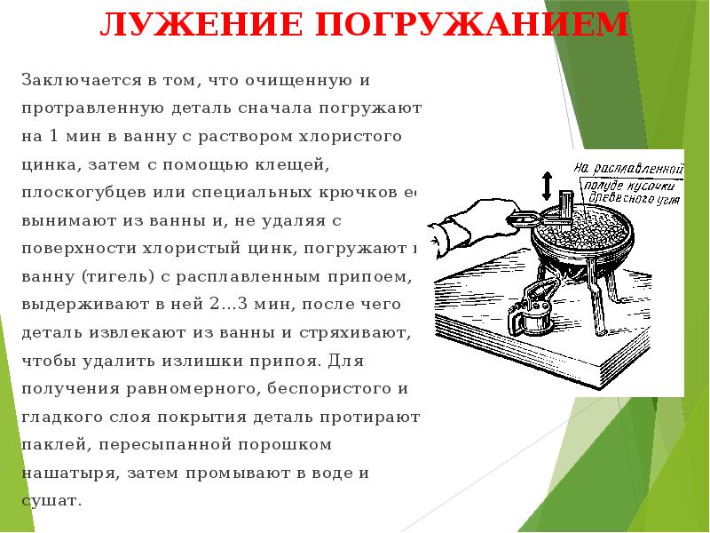 Cette méthode ne peut être utilisée qu'avec des fils entièrement étamés. La plongée a déjà une toute autre échelle, et se pratique en milieu industriel. Le processus est réalisé à l'aide d'une bobine spéciale avec du fil enroulé. Tout d'abord, toute la surface du cuivre est traitée manuellement avec des brosses rigides, et leurs poils sont préalablement traités avec du chlorure de zinc liquide. Le fondant dissous est obtenu à partir d'un mélange d'acide chlorhydrique technique et de zinc.