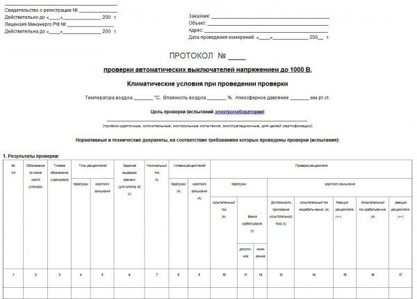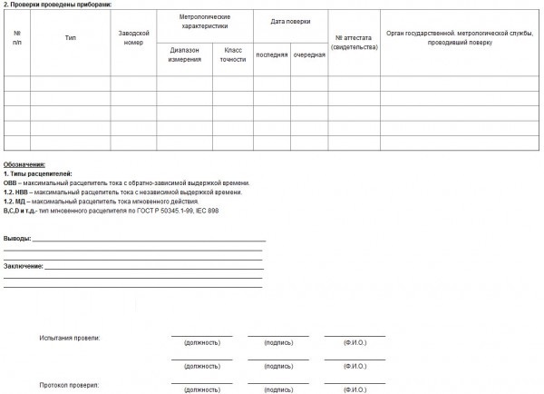 Le chargement des machines se fait selon un algorithme unique. Tout d'abord, vous devez étudier la documentation technique de l'appareil et déterminer les caractéristiques à vérifier. Ensuite, le fonctionnement des déclencheurs est testé : d'abord, ils fonctionnent toujours avec un bloc électromagnétique, puis avec un bloc thermique. Ensuite, les résultats sont entrés dans le protocole préparé sur le travail effectué.