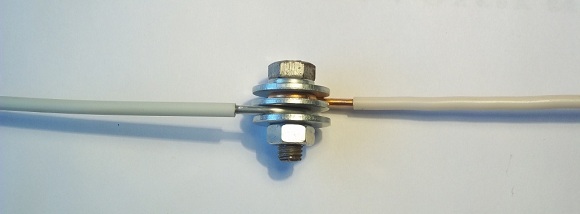 - Une rondelle est placée sur le filetage du boulon, puis le noyau de l'un des conducteurs, nettoyé de la gaine isolante, est vissé.