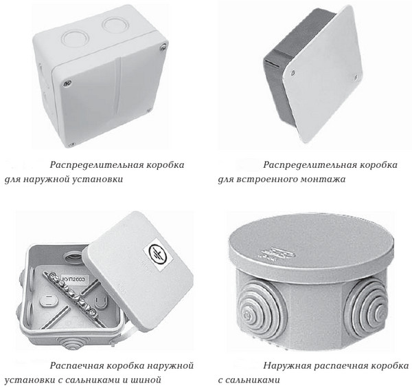 Divers échantillons de boîtes de jonction pour câblage électrique se distinguent par la méthode d'installation, ainsi que par le type de matériau utilisé dans leur fabrication et par un certain nombre d'autres caractéristiques. Selon le premier de ces critères, ils sont effectués dans les modifications suivantes :