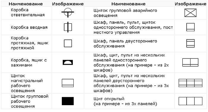 Pour désigner les cases sur les schémas électriques, des icônes spéciales sont utilisées, généralement sous la forme d'un cercle ou d'un carré avec des lignes droites y menant. Par leur association avec des symboles graphiques, ils sont répartis dans les catégories suivantes :