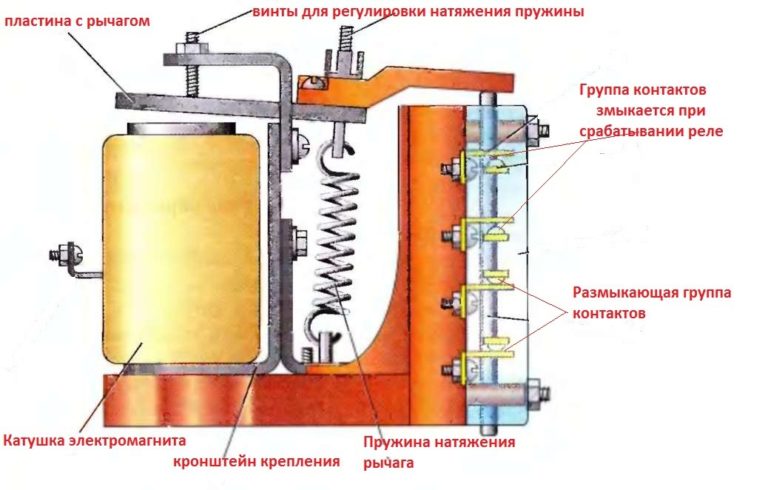 La base du fonctionnement est l'interaction coordonnée du flux magnétique de la bobine et de l'armature mobile, qui est magnétisée par ce flux. L'armature est maintenue par un ressort et ne touche pas le noyau tant que la tension n'est pas appliquée à l'enroulement.