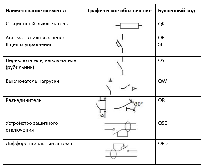 Il est recommandé de positionner les disjoncteurs comme QF1, QF2, QF3. Interrupteurs-sectionneurs - QS1, QS2, QS3. Les fusibles dans les schémas sont représentés par FU avec un numéro de série, où le codage de la lettre Q représente un commutateur ou un commutateur pour les circuits d'alimentation, et F est un protecteur. Cette combinaison est tout à fait applicable non seulement aux automates ordinaires, mais elle peut être utilisée pour désigner un automate dif dans le schéma.