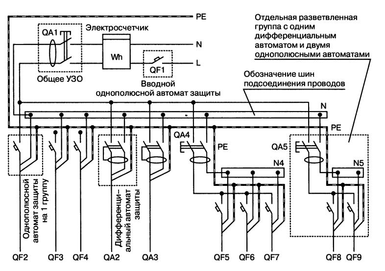 Si les désignations alphanumériques Q1 sont acceptées pour les disjoncteurs différentiels, alors pour les disjoncteurs différentiels (RCBO) - QF1. Les lettres indiquent les fonctions de l'appareil et les chiffres indiquent son numéro de série dans le schéma. Une autre combinaison de lettres est QF1D, où D signifie "différentiel".