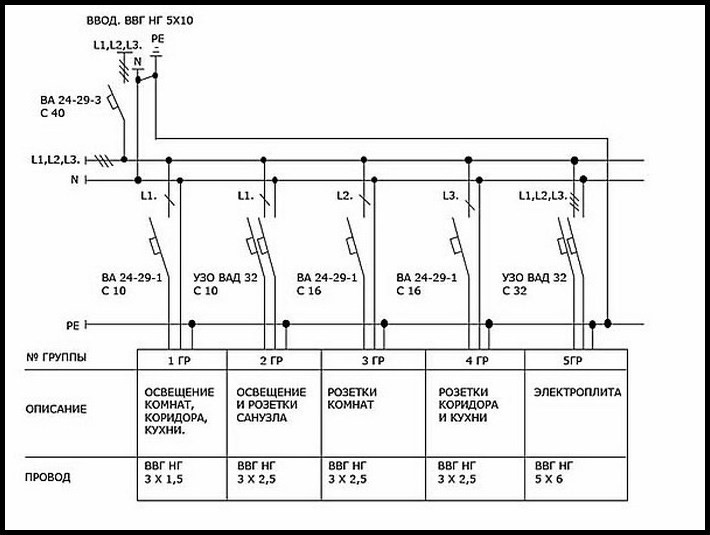 Cet exemple montre une connexion électrique triphasée. L'ensemble de l'appartement est alimenté par un câble d'entrée à 5 conducteurs d'une section de 10 mm2. Les phases sont numérotées comme L1, L2, L3, la mise à la terre est PE, qui se ferme à zéro. Une machine d'introduction (VA) éteint toutes les machines des groupes marqués de la même manière.