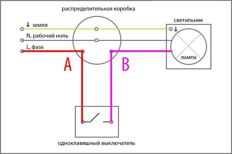 - l'interrupteur est toujours installé dans une coupure du fil de phase dont la deuxième extrémité est dirigée soit vers la boîte de jonction, soit directement vers le luminaire ;