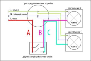 - dans un analogique à deux touches, ils devront être connectés alternativement à chacune des bornes de sortie, et regarder lequel des illuminateurs s'allume. Sur la base des données expérimentales, les contacts requis sont sélectionnés sous les désignations L1 et L2 ;