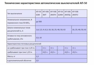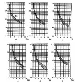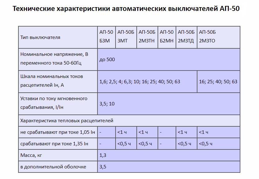 Les caractéristiques temps-courant de la série d'appareils AP-50 varient en fonction de l'indicateur de l'intensité du courant. Pour In en 1,6,2,5 et 4 A, le temps de réponse aux petits nombres de la multiplicité de courant (2-4) est plus court que pour les grandes valeurs de In, et aux grandes surcharges, au contraire, c'est un peu plus long. Les dégagements thermiques à toutes les valeurs de courant sont déclenchés par une surcharge de 1,5 à 3 fois et le temps de réaction varie entre 70 et 300 s. Les déclencheurs magnétiques pour 3,5 In sont activés plus lentement (jusqu'à 60 s) et pour 10 In - ils sont activés à huit fois ou plus de surcharge en un seul nombre de secondes.