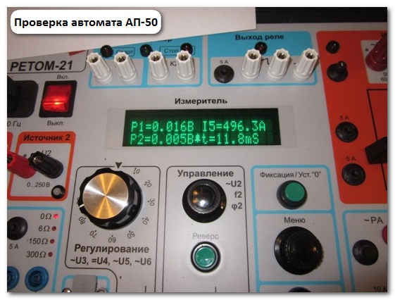 Par exemple, RETOM-21 peut être utilisé comme appareil de test. Il est connecté aux pôles les plus externes du disjoncteur après la connexion en série des pôles. Les tests sont effectués avec trois types de courant :