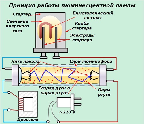 Un courant électrique est fourni, qui circule vers les électrodes. Le filament s'échauffe, provoquant une décharge accompagnée d'un rayonnement ultraviolet. Cette lueur traverse les parois du flacon, un phosphore et se transforme en lumière visible ordinaire.