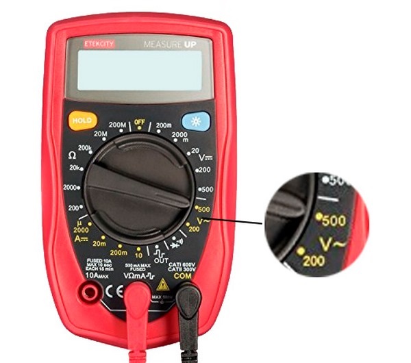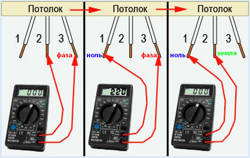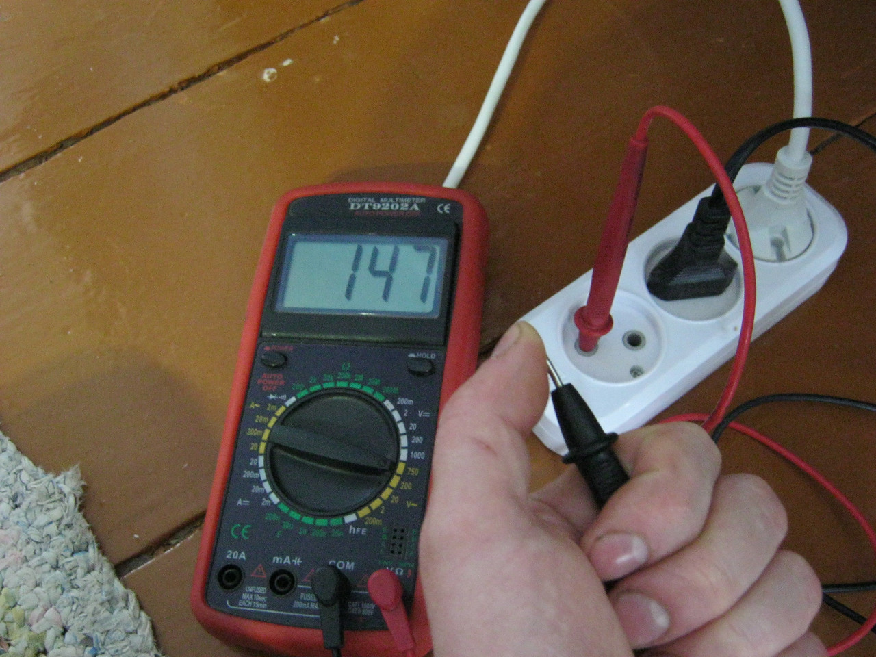 Le multimètre est en cours de préparation, une mesure de contrôle de la tension dans la prise est effectuée. Cela vous permet de vous assurer qu'il n'y a pas de rupture de ligne et que l'appareil lui-même fonctionne. Si les chiffres affichés à l'écran sont corrects, la connexion est correcte.