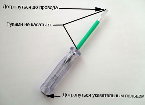 Pour trouver la phase, vous devez toucher le conducteur dénudé avec la piqûre de l'indicateur. Ensuite, vous devez toucher la zone de contact avec votre doigt. Si le voyant du tournevis s'allume, la piqûre a touché la phase. Sinon - zéro ou terre. Si les deux conducteurs présentent une phase, un dysfonctionnement grave peut être jugé.