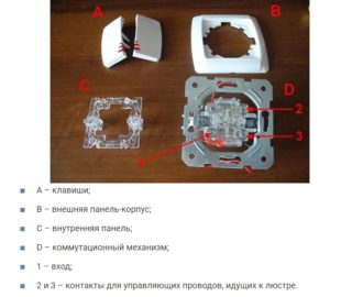 L'avantage du double interrupteur est sa conception simple. Une partie électrique est constituée de deux touches mobiles, d'une coque ou boîtier et de borniers, auxquels sont fournis courant et tension.
