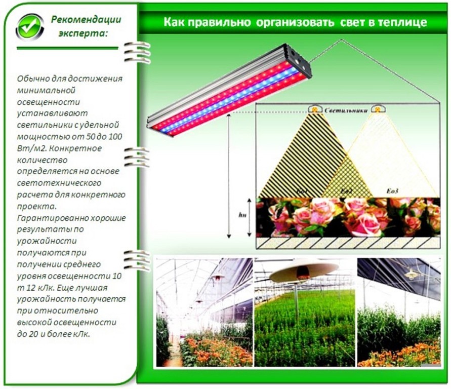 Avant de créer l'éclairage de la serre, vous devez calculer l'éclairage à l'avance. Un éclairage végétal de haute qualité comprendra plusieurs ampoules d'un spectre différent. Les luminaires doivent être installés de manière à ce que toutes les plantes reçoivent de la lumière.
