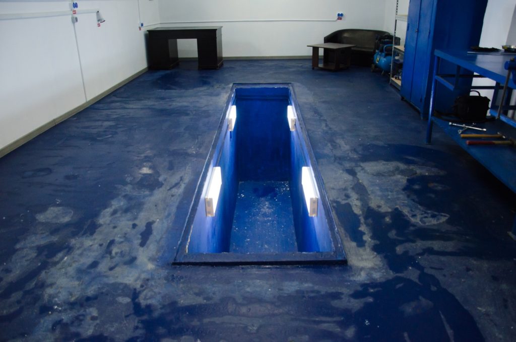 Une personne travaille à proximité d'appareils d'éclairage installés dans un fossé d'observation. L'accumulation d'humidité entraîne des fuites électriques, ce qui est dangereux pour les personnes. Cela augmente les exigences de sécurité pour l'agencement de l'éclairage dans le fossé d'observation.