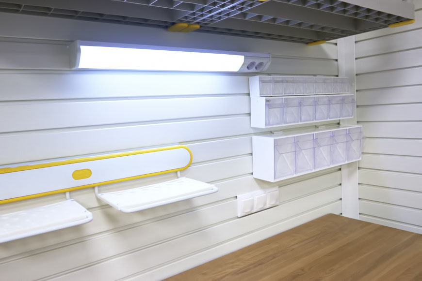 - Disponibilité de sources lumineuses séparées pour les zones de travail et les étagères.