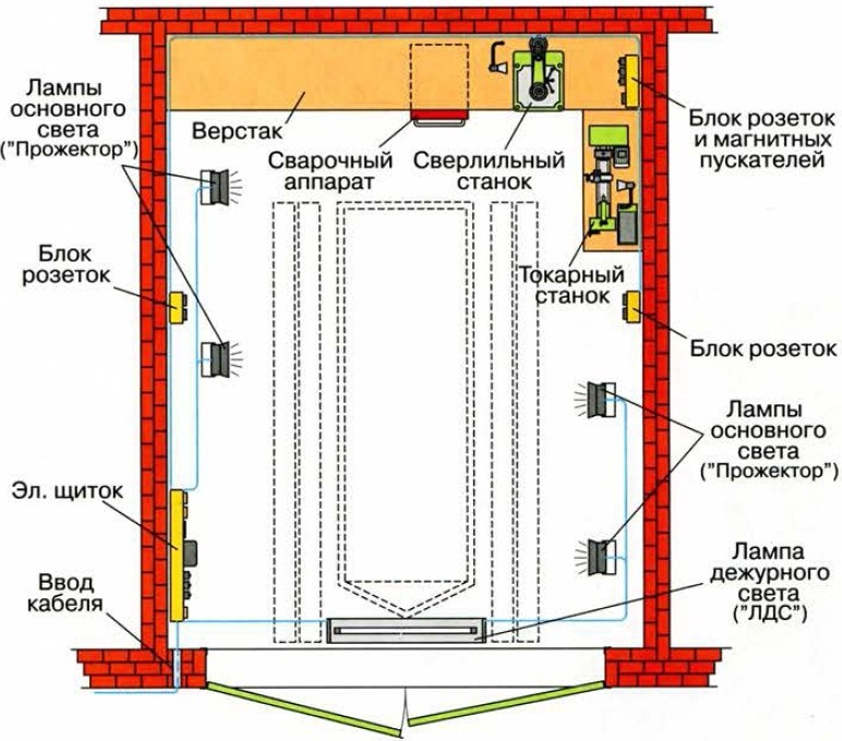 Il est nécessaire de déterminer quelle option d'éclairage est la meilleure pour ce garage. Un plan est établi, prenant en compte les caractéristiques de la pièce, les caractéristiques des dispositifs d'éclairage utilisés, les préférences du propriétaire.