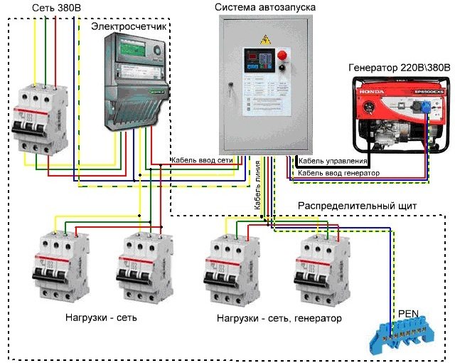 S'il n'y a pas de tension dans le réseau principal, le générateur est d'abord démarré, puis l'interrupteur est basculé en position de fonctionnement.
