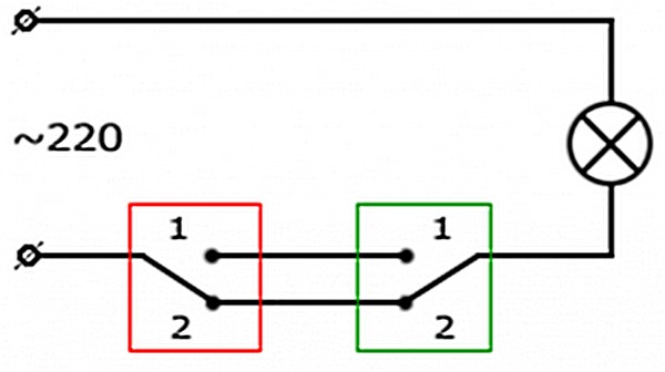 Un autre exemple de l'importance de contrôler un dispositif d'éclairage à partir de deux points est lorsqu'un interrupteur d'éclairage est installé à l'entrée de la chambre et qu'un interrupteur est installé près de la table de chevet. Lorsque vous appuyez sur le bouton de l'appareil à l'entrée de la pièce, le groupe de contacts est transféré sur la ligne électrique de l'illuminateur situé en son centre (des lustres par exemple). Lors de la commutation du deuxième appareil situé près du lit, d'autres contacts de groupe sont déclenchés pour l'éteindre.